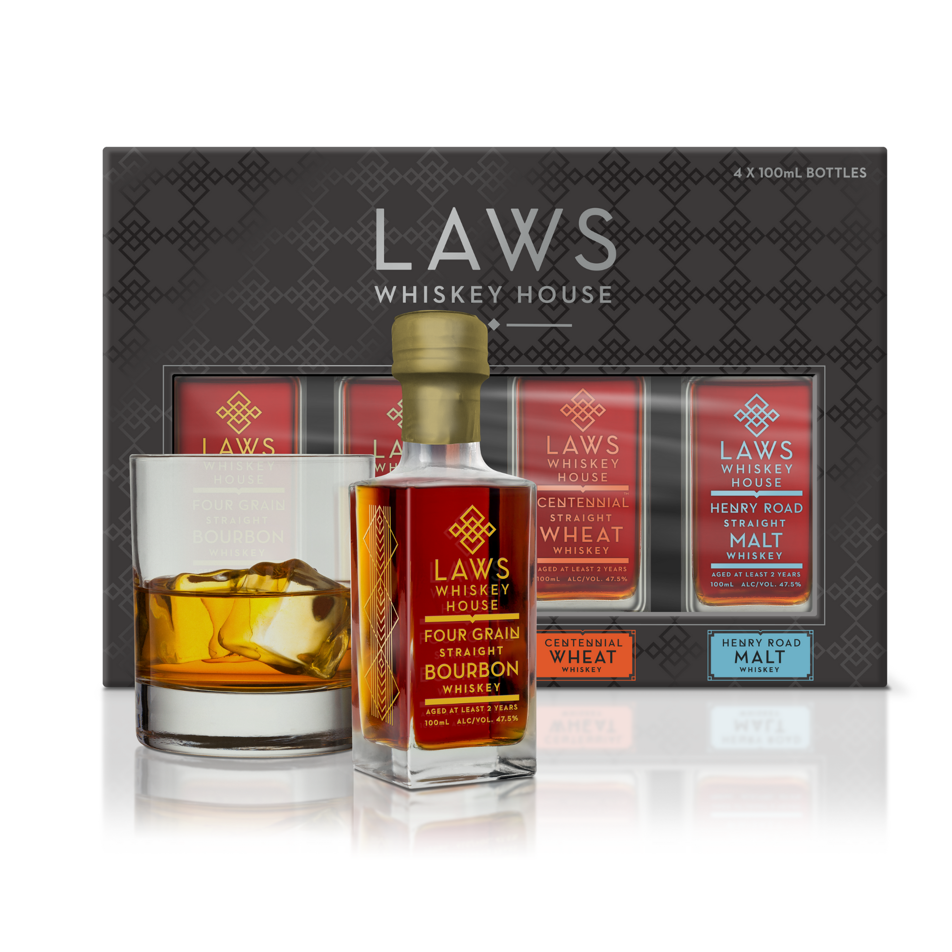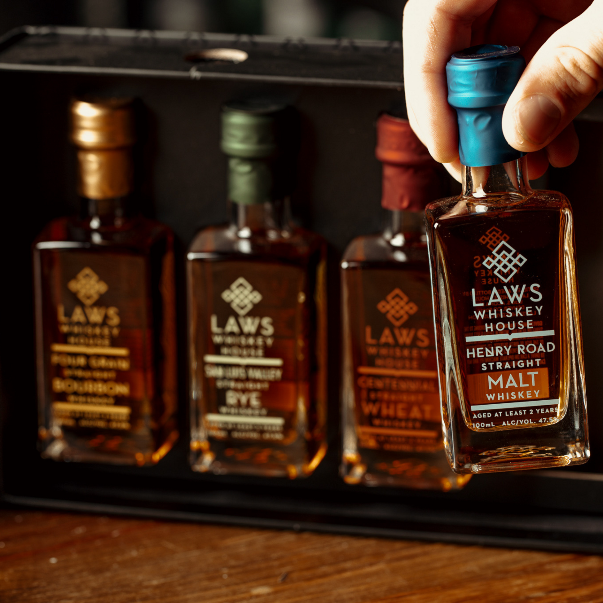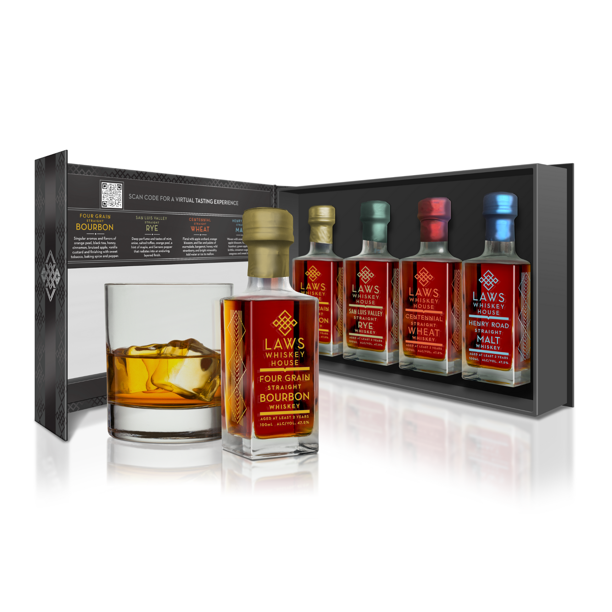 Need a gift for a whiskey lover? Or want to try our whiskey before committing to a 750ml bottle? The Laws Four-Pack is the perfect opportunity to taste and experience our best-selling whiskeys. Each pack also comes with a Virtual Tasting QR Code to enhance your sipping experience!